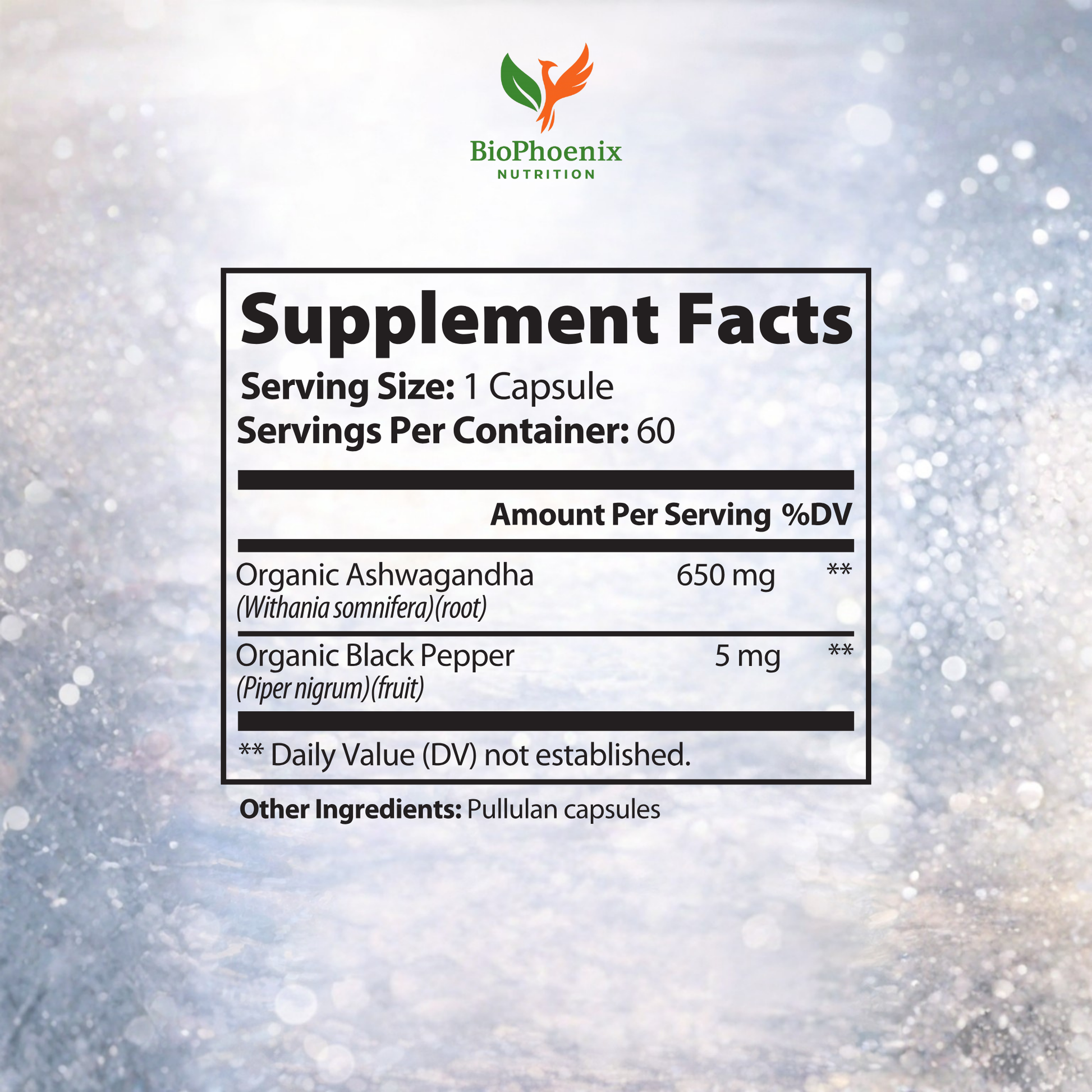 Organic ashwagandha root plus organic black pepper, in pullulan capsules.
